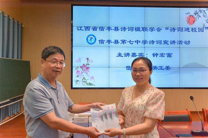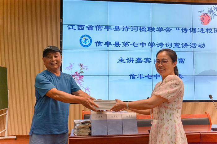 课后,信丰县诗词楹联学会向信丰县第七中学捐赠《橙乡诗词》学会专刊。江西省诗词学会会员张亦民向信丰县第七中学捐赠个人诗集。(陈春发供稿)