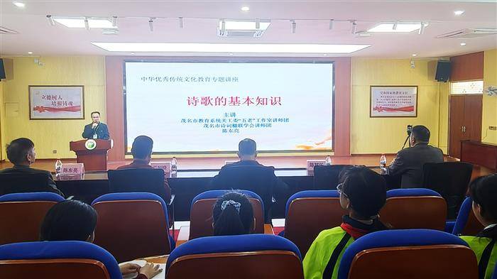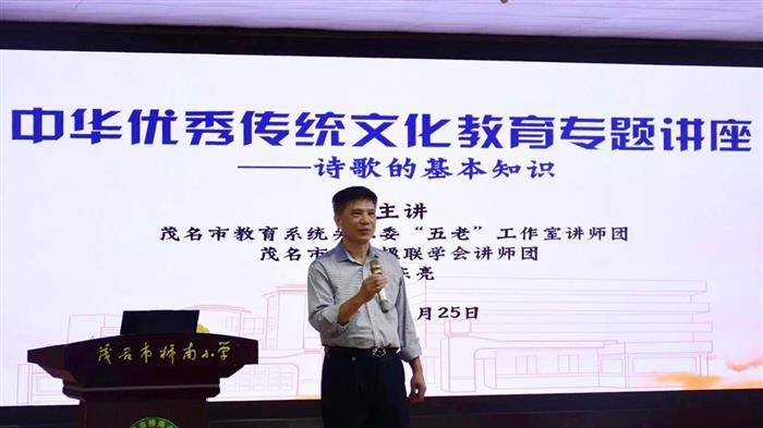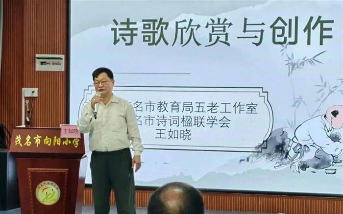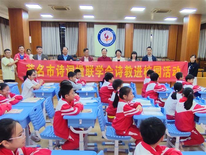 12月2日,诗词进校园活动在向阳小学举行。学会监事长王如晓主讲“诗歌欣赏与创作”,以《赠汪伦》《咏鹅》等经典诗作为例,用贴近学生的语言诠释诗意,同时融入《茂名山歌》《年例吟》等本土题材原创作品,使孩子们感受到诗词与生活的紧密连结。莫国强会长在交流中,就深化校园诗词教育提出多项建议,期望通过持续推动,营造浓厚的诗词学习氛围,让传统文化薪火相传。
