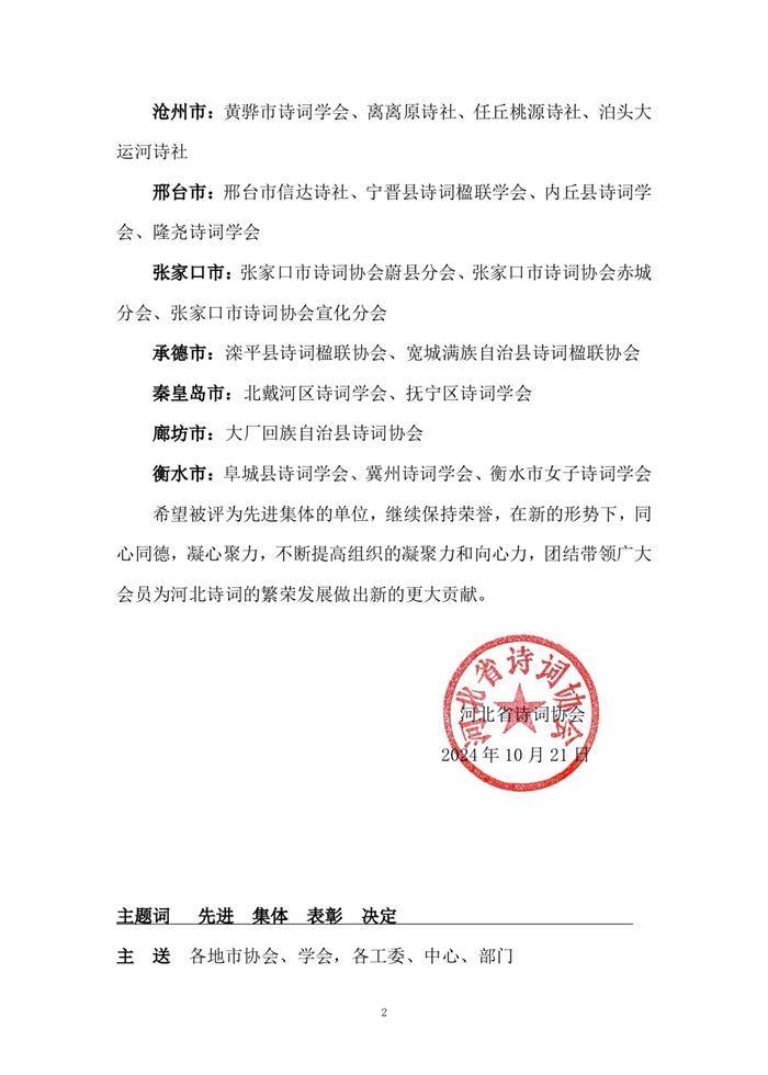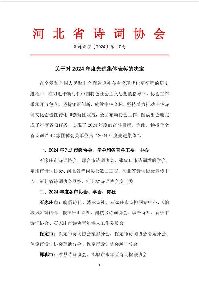喜报 热烈祝贺黄骅市诗词学会荣获省级“2024年度先进集体”荣誉称号